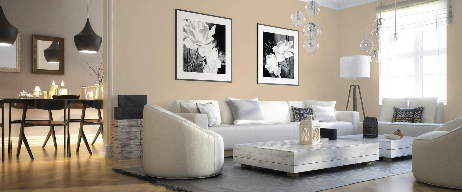 Проявляет себя как гармоничная база интерьера. В течение дня демонстрирует разные характеры — от свежести утра до уюта вечера.