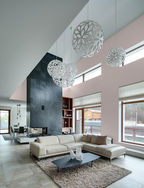 Проявляет себя как гармоничная база интерьера. В течение дня демонстрирует разные характеры — от свежести утра до уюта вечера.