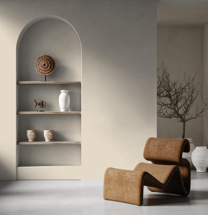 Сдержанный, элегантный оттенок, балансирующий между прохладным серым и песочным верблюжьим. Эта сложность делает его одним из самых элегантных архитектурных фонов, формирующим респектабельное пространство.